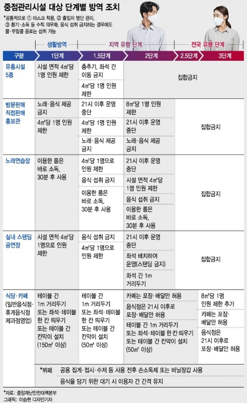 중점관리시설 대상 단계별 방역조치는 아래 표와 같은데, 1단계 생활방역부터 2단계까지 지역 유행 단계, 2.5단계부터 전국 유행단계로 나누어 조치가 됩니다.