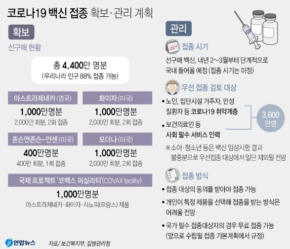 코로나 백신 내년 초 도입-접종시기 미정…노인-의료인 우선고려(종합), 신선미기자, 사회뉴스 (송고시간 2020-12-08 12:12)