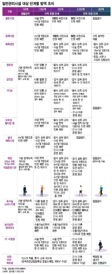 일반관리시설 대상 단계별 방역조치는 결혼식장, 장례식장, 목욕장업, 영화관, 공연장, PC방, 오락실, 실내 체육시설, 학원, 독서실 스터디카페, 놀이공원, 이미용업, 마트로 나뉘며, 자세한 사항은 아래의 표를 참고해보세요.
